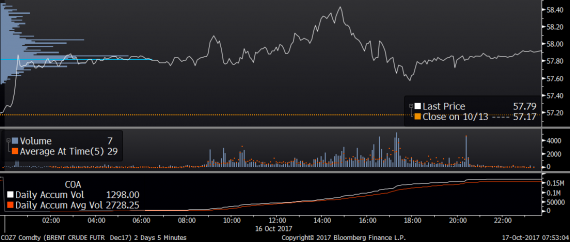 Důležité úrovně podle celkového volume na jednotlivých cenách (Brent future Dec17 8:00 – 22:00)