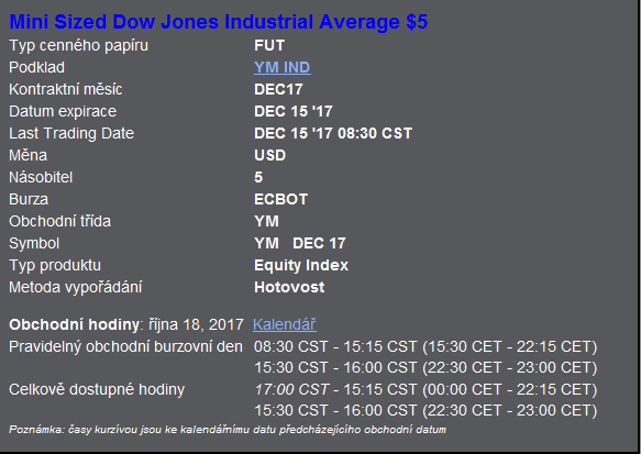 Důležité pro tradery jsou obchodní hodiny, během kterých je možné tento kontrakt obchodovat. Obchodování futures na Dow Jones prostřednictvím kontraktu YM probíhá stejně jako u ostatních amerických indexů na burzách CME a ECBOT, což značí, že trh je otevřen téměř 24h od pondělí do pátku. Investiční týden otevírá o půlnoci z neděle na pondělí a obchoduje se až do 22:15, kdy začíná krátká pauza 15 minut. Ve 22:30 obchodování pokračuje do 23:15, kdy začíná pauza 45 minut do půlnoci. Po půlnoci se obchodování opět rozbíhá.