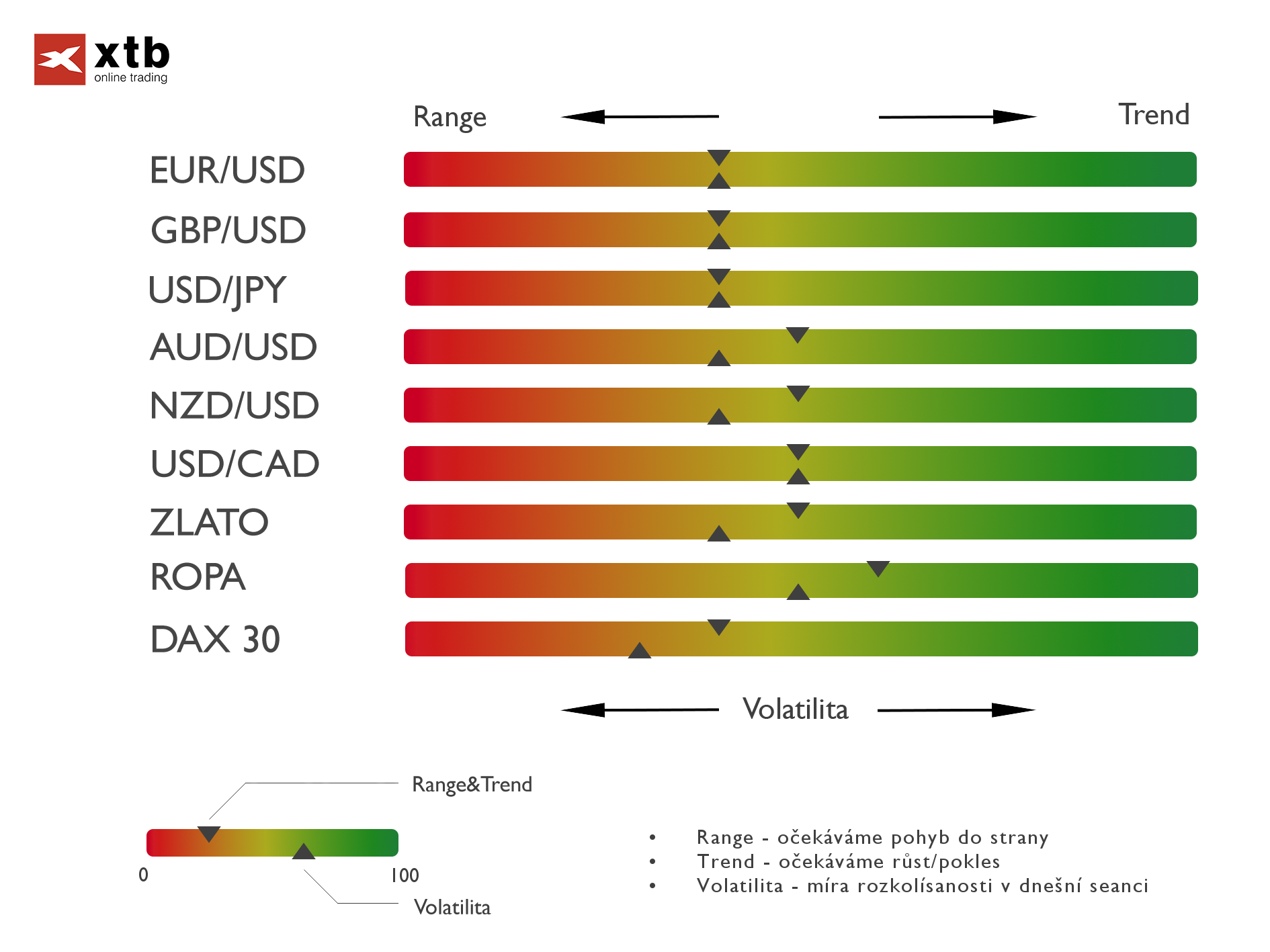 XTB Market barometr (Týdenní výhled) vyjadřuje náš náhled na momentální sentiment a na to, v jakém duchu by se během tohoto týdne mohlo nést obchodování na jednotlivých finančních aktivech. Pro každé aktivum se přitom zaměřujeme na jeho trendovost a netrendovost (range/chop) a na volatilitu. Možných scénářů a kombinací obou indikátorů je řada, ale níže nabízíme pro větší přehlednost pár extrémních scénářů, které by měly pomoci k lepší identifikaci toho, co indikátory range/trend a volatility symbolizují.