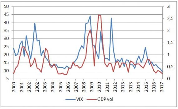 Dáva to zmysel, keď je rast ekonomiky stabilný, teda čelí nízkym výkyvom, tak je stabilný aj rast tržieb a ziskov v ekonomike, teda sa ľahšie investorom odhaduje, čo má za následok nižšiu volatiliu. A týmpádom sú nižšie aj obavy investorov výraznejšej zmeny hodnoty akcií, ktoré meria index VIX.