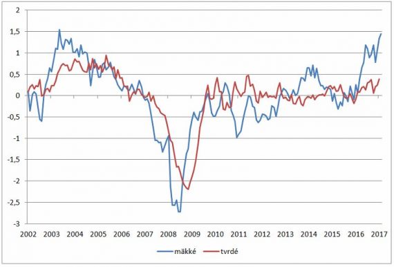 Odchýlka indexu tvrdých a mäkkých dát od dlhodobého priemeru