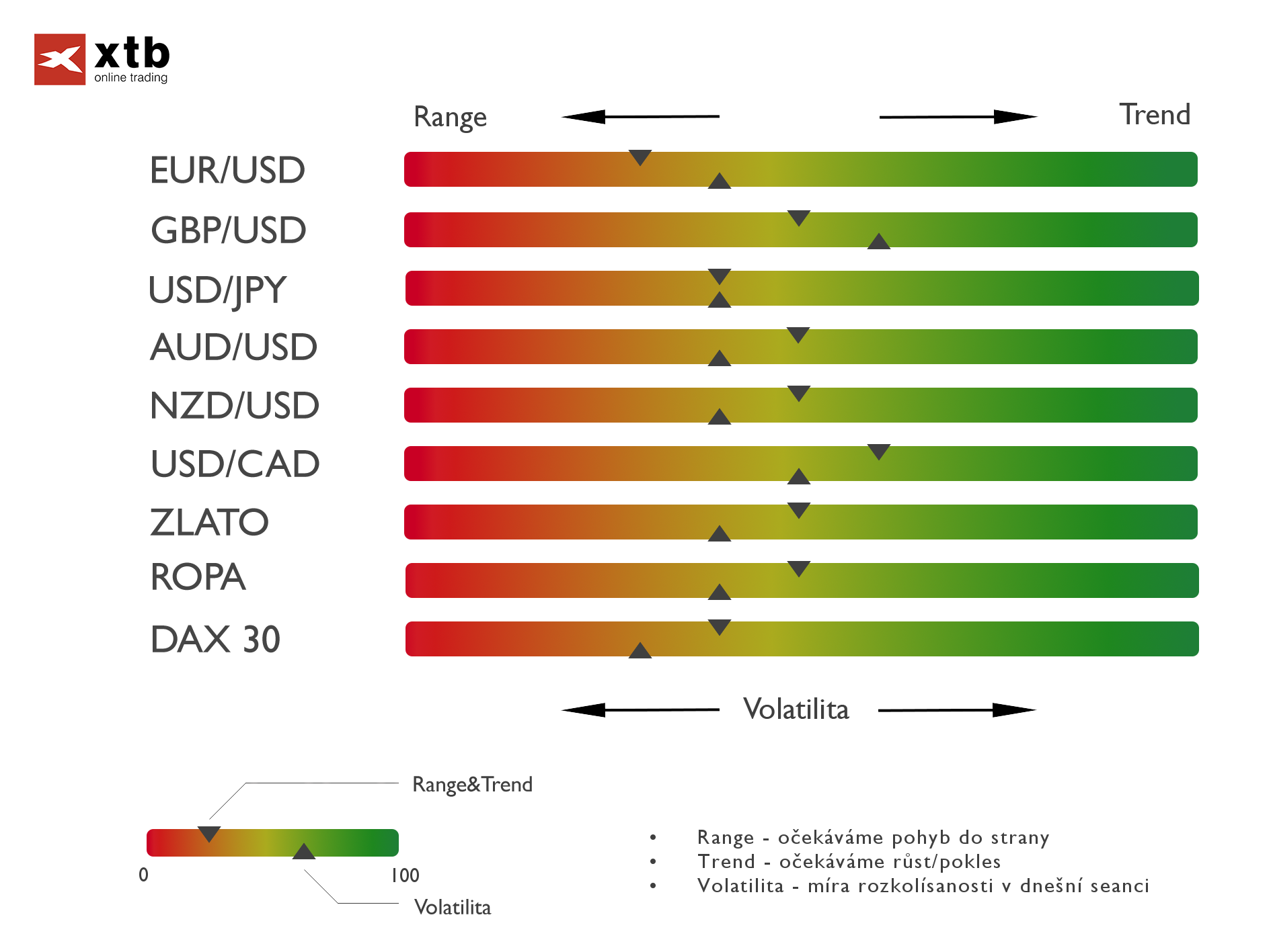 XTB Market barometr (Týdenní výhled) vyjadřuje náš náhled na momentální sentiment a na to, v jakém duchu by se během tohoto týdne mohlo nést obchodování na jednotlivých finančních aktivech. Pro každé aktivum se přitom zaměřujeme na jeho trendovost a netrendovost (range/chop) a na volatilitu. Možných scénářů a kombinací obou indikátorů je řada, ale níže nabízíme pro větší přehlednost pár extrémních scénářů, které by měly pomoci k lepší identifikaci toho, co indikátory range/trend a volatility symbolizují.