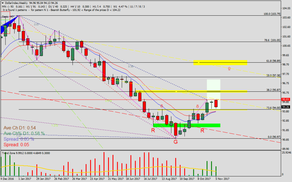 Nebylo velkým překvapením, že dolarový index zakončil minulý týden sestupnou korekcí, když uzavřel obchodování na hodnotě 94.10. To ovšem nic nemění na obecném růstovém trendu. -