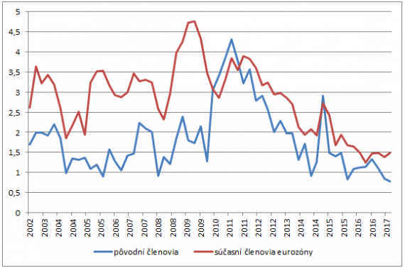 Smerodajná odchýlka medziročných rastov HDP medzi pôvodnými a súčasnými členmi eurozóny (bez Írska)