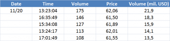 Největší obchody podle objemu na EURUSD future Nov17: