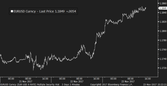 Tématem čtvrteční seance se zdá být vedle velmi dobrých evropských dat také politická situace v Německu, kde se po víkendovém krachu jednání o nové vládě zdá se otevírá prostor k dalšímu kolu vyjednávání. Angela Merkelová tak vládu nakonec možná sestaví, což by bylo dobrou zprávou především pro ceny rizikových aktiv a úroveň rizikových přirážek. Euro dnes i díky stabilizaci v Německu už od rána mírně roste a navazuje na svou včerejší úspěšnou seanci, když na páru s dolarem přidává okolo půl procenta.