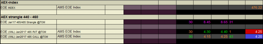 V příkladu níže vidíme index AEX, který byl na začátku roku poměrně volatilní. Rozhodli jsme se proto nakoupit opční strangle. Zaplatili jsem opční prémium ve výši €10,30.