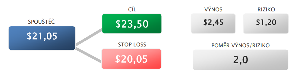 Budeme spekulovat na odražení ceny a vstup volíme těsně nad úroveň $21, což je maximum předchozích dvou dnů. Stop příkaz umístíme pod minimum aktuální korekce, což implikuje riziko okolo 5 %.