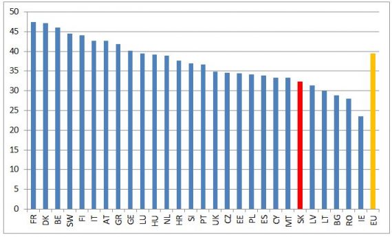 Poďme pekne po poriadku, najskôr sa pozrime na daňové a odvodové príjmy k HDP. V tejto štatistike vybralo Slovensko minulý rok v pomere k HDP 32,3%. Vážený priemer EÚ bol takmer 40%. Za nami je len päť krajín, pričom Írsko má tento údaj (podobne ako všetky ostatné, ktoré sa vyjadrujú v pomere k HDP) umelo výrazne skreslený nadol, kvôli účtovnému nafukovaniu HDP skrz daňovú relokáciu firiem a leasing lietadiel.
