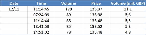 Největší obchody podle objemu na GBPUSD future Nov17: