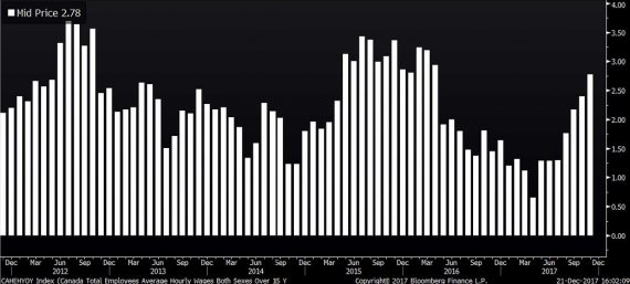 Vývoj v Kanadskej ekonomike je teda aktuálne podľa predstáv Bank of Canada, čo nahráva ďalšiemu zvyšovaniu úrokových sadzieb. Aktuálne počítajú trhy s tým, že sadzby pôjdu nahor už v januári a do konca budúceho roka počítajú s ďalšími dvoma zvýšeniami (celkovo teda s troma v roku 2018). Pokiaľ ostane inflácia a rast miezd na aktuálnych úrovniach, tak ich pokojne môže byť aj viac.