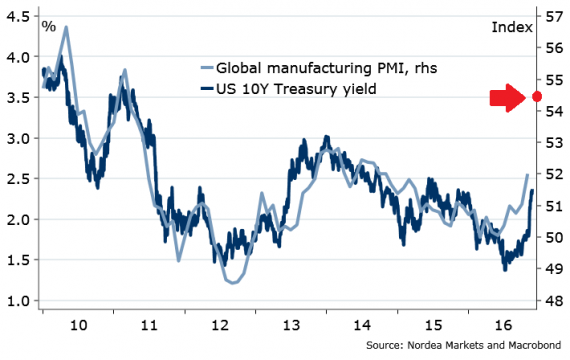 Potom tu mám jeden hard-core graf. Korelácia s globálnym indexom výrobnej dôvery. Logika je taká, že čím sa lepšie vyvíja globálna ekonomika, tým nižší dopyt by mal byť po bezpečných amerických dlhopisoch a týmpádom aj vyššie výnosy. Tu bohužiaľ nemám dostatočné historické dáta (v bloombergu sú dostupné len tri roky dozadu), tak si pomôžem starším grafom od Nordea Markets (ktorý je z konca roka 2016), do ktorého som zakreslil aktuálnu hodnotu globálneho výrobného PMI (na úrovni 54,5b.). Výnosy sú aktuálne zhruba rovnaké ako v tom grafe tmavomodrou. Podľa globálneho PMI by mali byť aktuálne až okolo 3,5%. Vyzerá to tak, že táto korelácia sa nateraz definitívne pokazila, roztiahnuté nožnice však môžu naznačovať, že určitý priestor pre rast výnosov existuje.