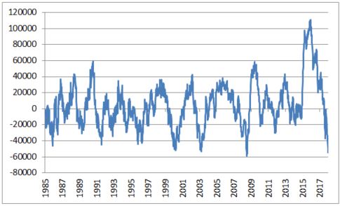 V posledných týždňoch sa však deje iná vec, ktorá je viac v úzadí – americké zásoby ropy začali po stagnácii v jesenných mesiacoch koncom roka opäť prudko klesať. Hlavným dôvodom bude silný dopyt, keďže ťažba pokračuje v raste. Od polovice novembra klesli o takmer 33 mil. barelov (čo predstavuje viac ako sedempercentný pokles). Zásoby sú aktuálne dokonca nižšie ako pred dvoma rokmi. A to začínali rok 2017 na historických maximách.