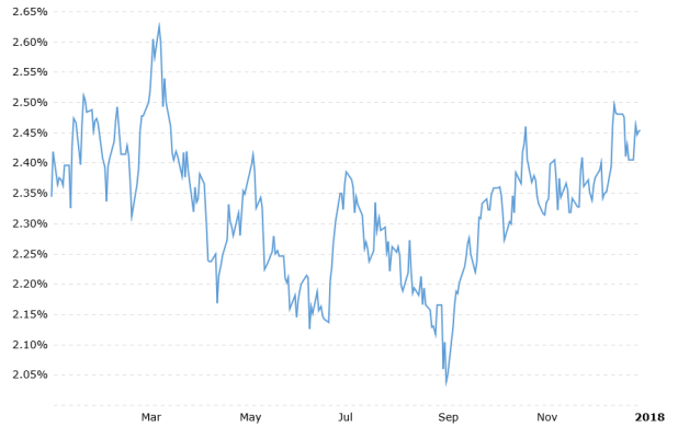 Benchmarkový desetiletý úrokový výnos bondů se zvýšil o 2 bazické body na 2,474 procenta, v nápadné vzdálenosti devítiměsíčního vrcholu ve výši 2,504 procent, který byl zaznamenán 21. prosince 2017.