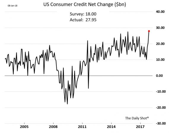 Objem spotrebiteľských úverov v americkej ekonomike poskočil v decembri o 28 mld. USD. Jedná sa druhé najvyššie číslo v histórii, vyššie bol len v roku 2001. Slabší vývoj spotrebiteľských úverov v posledných mesiacoch teda nebol štrukturálnym problémom, ale len nejakou kombináciou sezonality a nižšej potreby brať si dlh. To, že banky v USA nechcú úverovať, čo bola obava niektorých analytikov, sa teda aktuálnymi číslami vyvrátilo (@SoberLook):