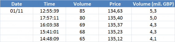 Největší obchody podle objemu na GBPUSD (aktivní future kontakt):