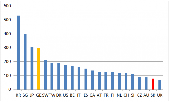 Počet priemyselných robotov na 10-tisíc pracovníkov v priemysle v roku 2015. SK- červená, GE – žltá (Zdroj: Medzinárodná federácia robotiky)