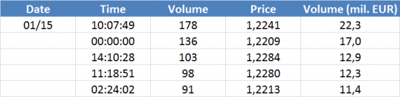 - nejvíce obchodů zrealizováno na ceně 1.3800