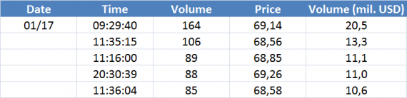 Největší obchody podle objemu na GBPUSD future Nov17: