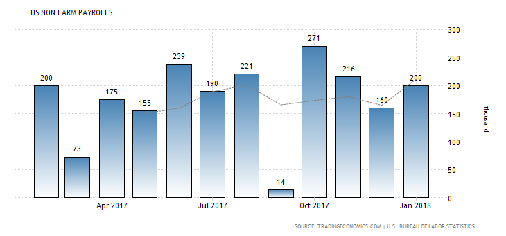 Mzdy v USA v lednu vzrostly v souladu s očekáváním trhu. Nově vytvořená pracovní místa mimo zemědělský sektor se zvýšily o 200 tisíc. Nárůsty byly zaznamenány především v soukromém sektoru, který zaznamenal růst o 196 tis. Míra nezaměstnanosti zůstala na úrovni 4,1%. Průměrný hodinový plat vzrostl o 0,3 procenta a meziročně se zrychlil na 2,9 procenta. Jedná se o nejrychlejší tempo růstu mezd od roku 2009.