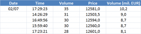 Největší obchody podle objemu na DAX (aktivní future kontrakt)