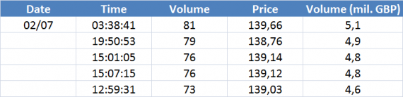 Největší obchody podle objemu na GBPUSD (aktivní future kontrakt):