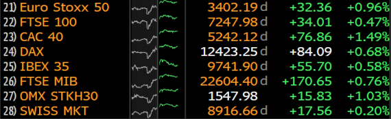 Finanční trhy dnes plynule navázaly na včerejší seanci a pokračují v likvidaci ztrát, které od začátku měsíce nabraly. I dnes se tak drží indexy kompletně v zelených číslech, přičemž obchodování znovu probíhá na nadprůměrných objemech. Po velmi silné Asijské seanci dnes Evropa roste o 0,5 % – 1,5 % a jasně v zelených číslech se zatím drží také futures na indexy v USA.