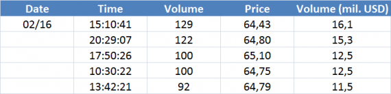 Největší obchody podle objemu na Brent (aktivní future kontrakt)