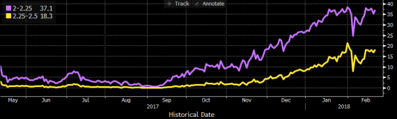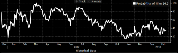 Vše samozřejmě bude záležet na makru a dalším vývoji inflace, ale pokud se dnes podíváme na výhled trhu pro americké sazby, existuje podle ocenění futures na sazby zhruba 37% šance na to, že v USA sazby do konce roku 2018 vzrostou ještě třikrát a 18% šance na to, že vzrostou dokonce čtyřikrát. To tedy představuje více než 50% šanci na trojnásobné zvýšení úrokových sazeb, které by tak vyrostly až do pásma 2 – 2,25 %. Zajímavé je, že únorová korekce na akciovém thru s touto šancí docela zamávala. Zatímco ale trhy po výplachu ze začátku února zůstávají stále nervózní, výhled pro sazby je zpět tam kde by před únorovou korekcí.