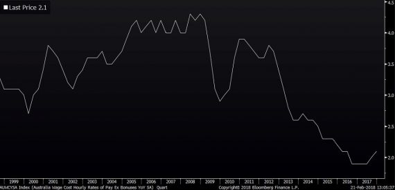 Dnes ráno dorazili z Austrálie štatistiky vývoja miezd. Medzikvartálne zaznamenali v posledných troch mesiacoch minulého roka rast o 0,6%, čo prekonalo trhový konsenzus na úrovni rasti o 0,5%, čo poslalo ich medziročný rast na úroveň 2,1%. Jedná sa o druhý medziročný rast miezd v rade, čo sa naposledy stalo v roku 2010. Nedá sa teda vylúčiť, že sa jedná o zárodok nového trendu, ktorý môže ich rast dostať vyššie od historických miním 1,9%, ktoré boli prítomné od Q3 2016 do Q2 2017.