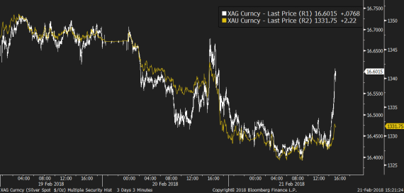 Po pár slabších dnech se dnes o slovo přihlásili po delší době také býci na drahých kovech, kteří navzdory sílící americké měně pomohly v odpoledních hodinách cenám zlata i stříbra bez zjevného fundamentu vzhůru.