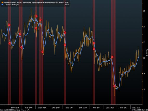 Na rozdiel od tvrdých dát, mäkké sú stále mimoriadne silné. Spotrebiteľská dôvera dosiahla historické maximum. Ťahajú ju aj očakávania rastu miezd. Podiel respondentov, ktorí očakávajú zvýšenie mzdy v najbližších šiestich mesiacoch je 23,8. To je najviac od roku 2002, teda ešte viac ako počas predkrízového boomu. Spotrebitelia by teda americkú ekonomiku nemali brzdiť (@boes_):