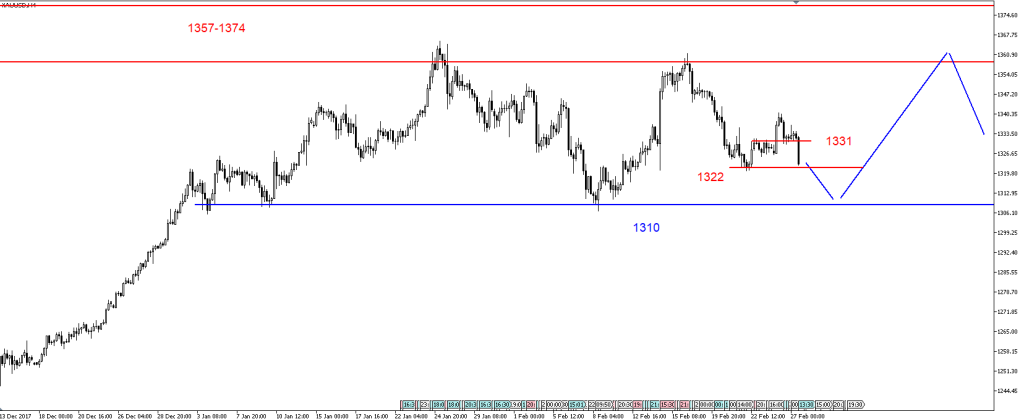 V pondělí 26. 3. 2018 došlo k dalšímu růstu ceny zlata. Cíl tohoto růst může být silnou bariérou kolem hodnoty 1 357 USD. Po překonání této úrovně očekáváme vybírání zisků. Aktuálně se zlato obchoduje za 1353.065 USD. Jakmile tedy dojde k překročení úrovně 1 357 USD, očekáváme silný pokles ceny zlata. Tento pohyb je znázorněn na grafu níže. Podpora se nachází okolo hranice 1 339 USD. -