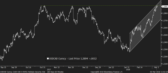 Z technického hlediska je situace o to zajímavější, že se na této úrovni potkává tato resistence i s horním hranou strmě rostoucího trendového kanálu, ve kterém se USDCAD drží od konce ledna a díky kterému se začíná pohybovat v lehce překoupených úrovních. Fundamentální situace na CAD je navíc i nadále poměrně slušná, když by podle názoru trhu měly růst sazby v Kanadě dokonce rychleji než v USA.