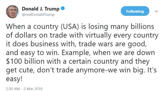 Trump mal piatok zase raz hviezdny moment. Na twittri napísal, že je veľmi jednoduché vyhrať obchodnú vojnu. Keď má USA s nejakou krajinou obchodný deficit 100 mld., tak je riešením s ňou neobchodovať. Nepriamo teda opäť vyzval k obchodným obmedzeniam.