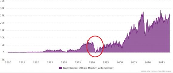 Obchodné deficity/prebytky môže znížiť len zmena úspor a/alebo investícií. Historicky pekný príklad poskytuje Nemecko. Po zjednotení sa krajina dostala z vysokého prebytku obchodnej bilancie do mínusu. Nie kvôli tomu, že klesol dopyt zahraničia po nemeckých výrobkoch (alebo že by niekto zaviedol clá). Ale z toho dôvodu, že východné Nemecko si vyžadovalo masívne investície. Tie jednak spotrebovali časť západonemeckej produkcie, ktorá išla predtým na export. A takisto zvýšili importy tých produktov potrebných pre investície, ktoré si Nemecko nedokázalo samo vyrobiť.