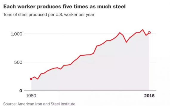 Hlavný dôvod poklesu zamestnanosti v oceliarskom priemysle je teda niekde inde – v technologickom pokroku, teda v automatizácii. V 80.tych rokoch sa na jedného zamestnanca amerického oceliarskeho priemyslu vyrobilo niečo cez 200 ton ocele, dnes je to päťkrát viac. Všimnite si v grafe nižšie, že keď sa začiatkom milénia zastavil rast produktivity v oceliarskom priemysle, tak sa zastavil aj pokles počtu pracovných miest v grafe vyššie. To potvrdzuje silný vzťah medzi produktivitou a zamestnanosťou v sektore.