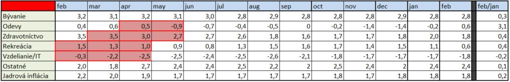 Jadrová inflácia je teda len stotinky od toho, aby bola na úrovni 1,9% a prichádzajú tri/štyri mesiace, počas ktorých je takmer isté, že inflácia a aj jadrová inflácia pôjdu nahor, pretože sa budú porovnávať voči nižšej báze. Pred rokom v marci sa prepadla medziročná zmena cien v kategórii vzdelanie/IT kvôli konkurenčným vojnám mobilných operátorov v oblasti dátových služieb z -0,3% na -2,2%, v marci teda báza v tomto segmente výrazne klesne. Navyše, v minulom roku rast cien rekreácie spomalil medzi februárom a aprílom z 1,5% na 1% a rast cien v zdravotníctve medzi marcom a májom z 3,5% na 2,7%.