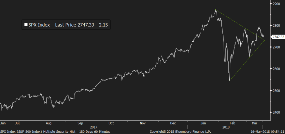 Po únorovém výplachu a následné korekci ztrát ze začátku měsíce akciové indexy v tomto týdnu zatím hledají jednoznačný směr. Fundamenty které by jej udaly zatím chybí a tak to jediné co máme je technická situace a trochu nervózní vytváření nižšího low, které zatím nahrává spíše medvědům. Ti se mohou částečně opírat také o fundament, v podobě rostoucích dluhopisových výnosů které se v případě 10yr splatností v USA dál nebezpečně přibližují k 3% hranici a jejichž další růst může být alespoň dočasným katalyzátorem dalších výprodejů. -