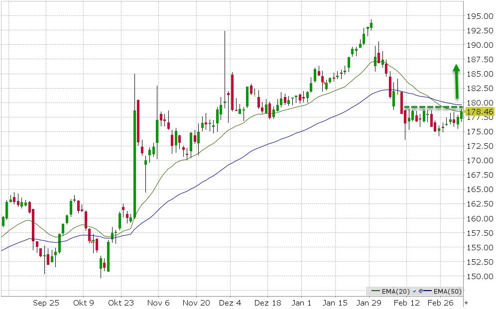Do nákupní pozice budeme vstupovat na ceně $179,50 tedy po průrazu diskutované hladiny.Je ale důležité, aby růstová svíce uzavřela nad touto hladinou. Stoploss pokládáme pod poslední minimum na cenu $173,50 a s profitem míříme na $192,00.
