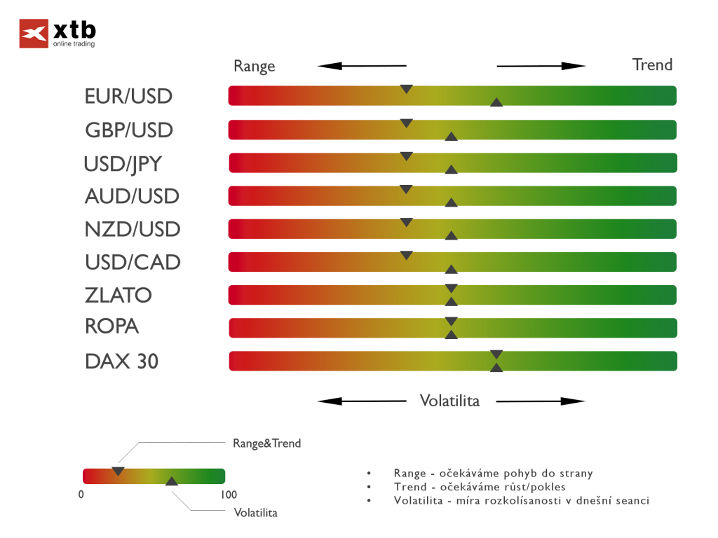 XTB Market barometr vyjadřuje náš náhled na momentální sentiment a na to, v jakém duchu by se během dnešní seance mohlo nést obchodování na jednotlivých finančních aktivech. Pro každé aktivum se přitom zaměřujeme na jeho trendovost a netrendovost (range/chop) a na volatilitu. Možných scénářů a kombinací obou indikátorů je řada, ale níže nabízíme pro větší přehlednost pár extrémních scénářů, které by měly pomoci k lepší identifikaci toho, co indikátory range/trend a volatility symbolizují. -
