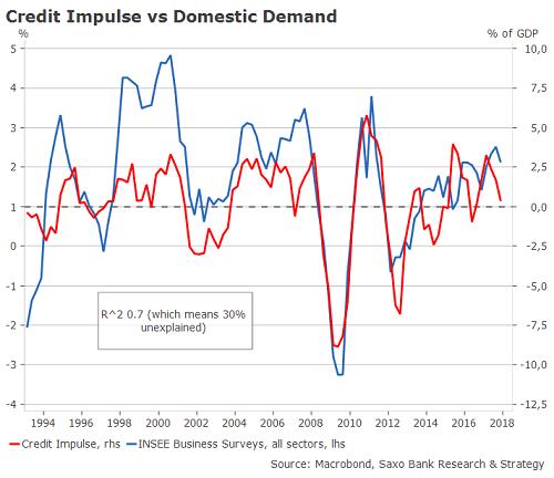Reformy na podporu podnikání a silný úvěrový impuls, který skutečnou ekonomiku předchází zhruba o 9-12 měsíců, se projevily v celkovém zlepšení ekonomických údajů ve Francii: vyšší PMI, rostoucí domácí poptávka a soukromé investice navracející se na úroveň z roku 2010. Mezi francouzským úvěrovým impulsem a finální domácí poptávkou (a také fixními soukromými investicemi) existuje vysoká korelace 0,70 ku jedné.