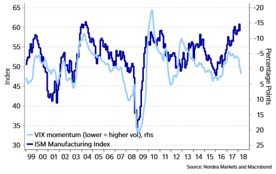 Dôvera vo výrobe v USA (ktorá je mimochodom mimoriadne vysoko aj v eurozóne) však ukazuje, že nervozita by mala byť nižšia. Indikátor momenta na VIXe (pravá os, inverzne) sa odpútal od indexu dôvery. Pokiaľ by ho mal nasledovať aj naďalej, tak by mal byť na akciách podstatne väčší pokoj ako je v súčasnosti (@AndreasSteno):