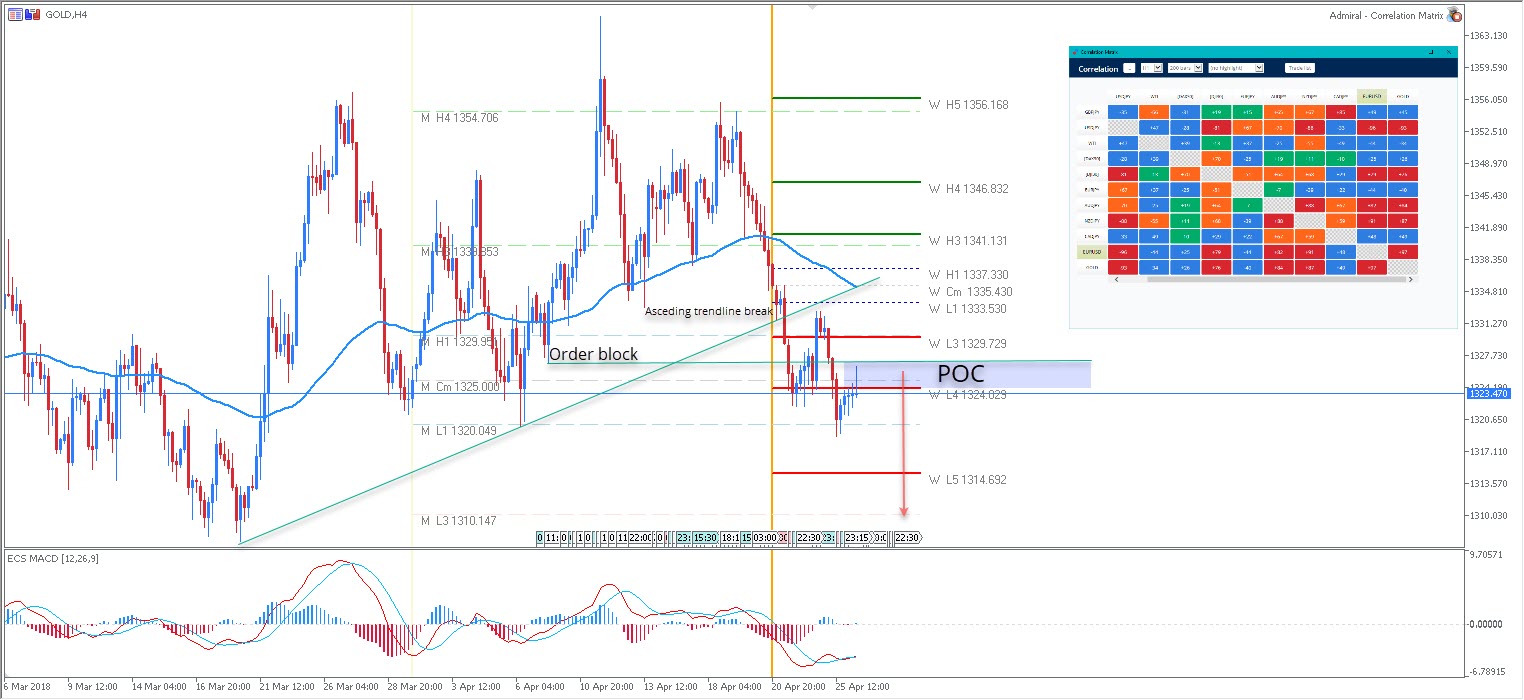 Podíváme-li se na korelační matici, můžete také vidět, že existuje velká pozitivní korelace mezi GOLD a EUR/USD. Pokles EUR/USD se odráží také na GOLD a naopak. 1324-25 je zóna, kde bychom mohli vidět další odmítnutí směrem k M L1 - 1320.049 a W L5 - 1314.69. To také znamená obrovskou medvědí strukturu, která je trochu podobná tvaru M, takže Gold by mohl jít na měsíční test L3 -1310.14.w
