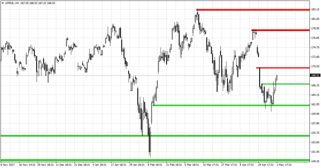Apple pokračuje vzhůru. Nejbližší cíl pro obchodníky je cena z 20. dubna 2018 (171 $ – 171,22 $). Pokud bude porušena, bude možné očekávat zvýšení ceny akcií Apple až na 175 či na 175,39 USD. Dalším potenciálním odporem je maximum ze 17. dubna 2018 (178,75 $ – 178,98 $). Nejbližší podporou ceny akcií Apple je díra z 1. května 2018 (165,27 dolarů – 165,5 dolarů). Pokud bude tato podpora překročena, bude možné otestovat dno z 27. dubna 2018 (160,63 – 161 dolarů).