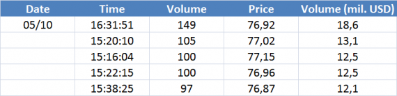 Největší obchody podle objemu na Brent (aktivní future kontrakt)