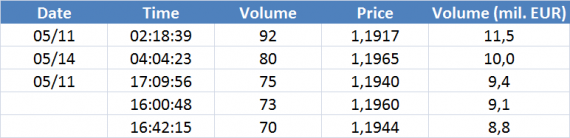 Největší obchody podle objemu na EURUSD (aktivní future kontrakt):