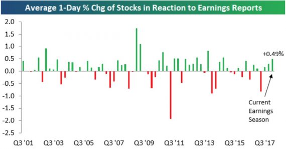 Skvelý graf, ktorý potvrdzuje, že hlavným driverom rastu akcií v posledných týždňoch bola výsledková sezóna – priemerná zmena ceny akcie spoločnosti v indexe S&P bola v obchodný deň zverejnenia výsledkov pol percenta. Takýto silný rast bol zaznamenaný naposledy v roku 2014 (@ldaalder):