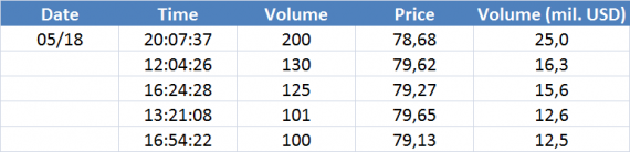 Největší obchody podle objemu na Brent (aktivní future kontrakt)