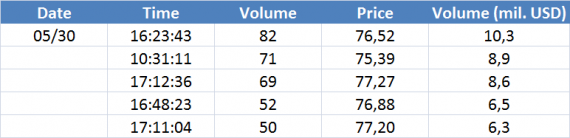 Největší obchody podle objemu na Brent (aktivní future kontrakt)